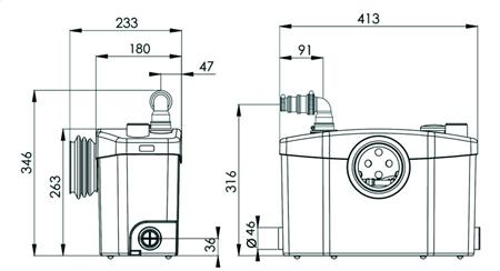 A legújabb SFA zajcsökkentő technológiákkal van felszerelve, és csendes, zajelnyelő elemekkel rendelkezik. Ez minimalizálja a működési zajt, így csendesebb lehet, mint egy WC öblítőtartálya. Nagyon hatékonyan működik, rövid ciklusokban (2-3 másodperc), ami energiahatékony és megbízható vízelvezetést biztosít. Akár 5 méteres függőleges emelési magasságra és 90 méteres vízszintes szállításra is képes.