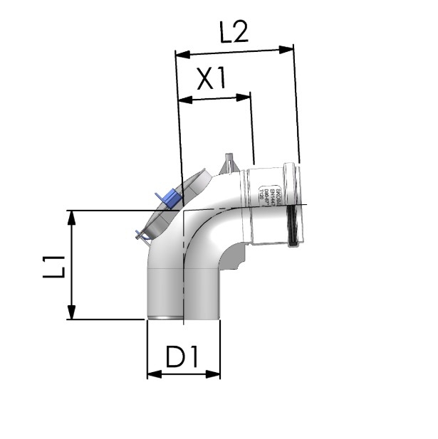 A könyökidom lehetővé teszi a füstgáz elvezetését 90°-os szögben, miközben nem foglal több helyet, mint egy sima könyök, de plusz funkciót (ellenőrzés) biztosít.